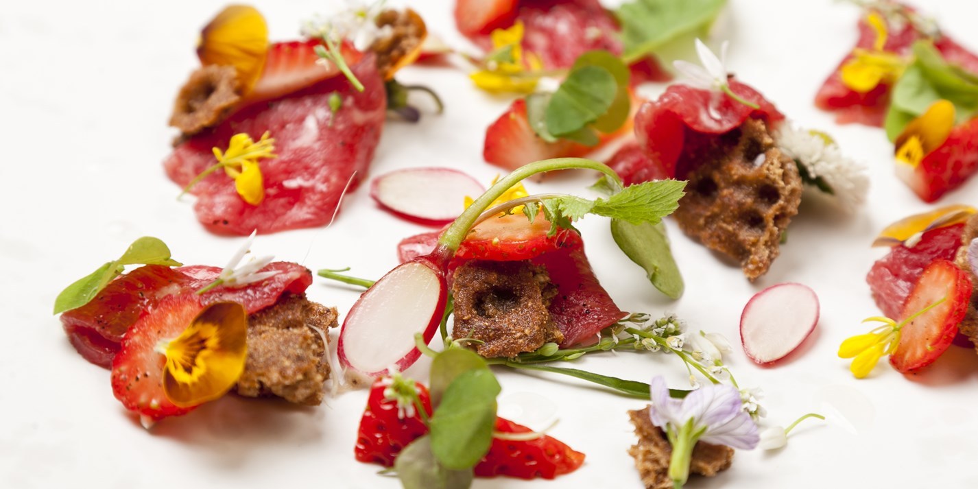 Season and oil the beef slices and arrange on a plate. Drain the strawberries (ensuring that you reserve some of the pickling liquid) and place them on top of the beef