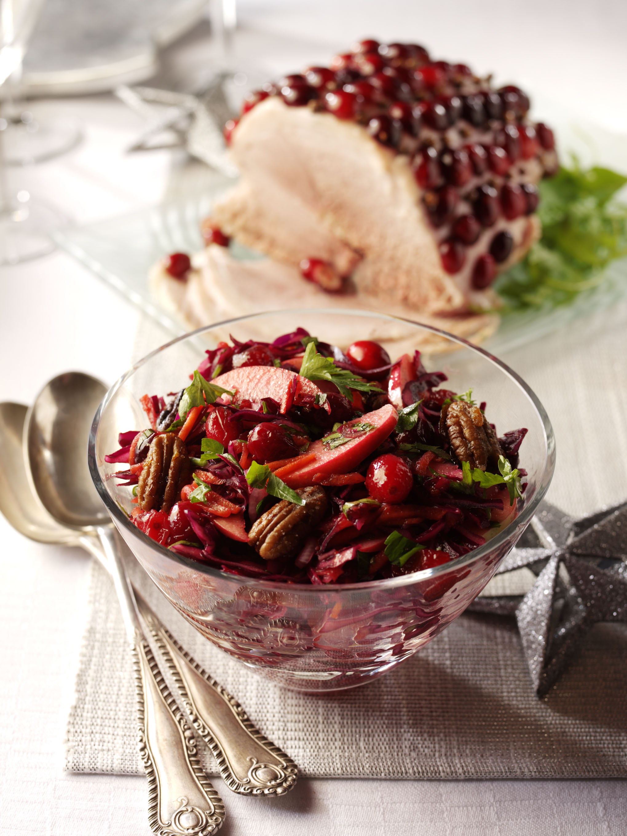- In a large bowl mix together the red cabbage, shallots, carrots, apple, parsley and olive oil, before tossing in the cranberry mixture. Place in a serving bowl and sprinkle over the pecans. Serve with cold Christmas meats such as cranberry glazed ham.
