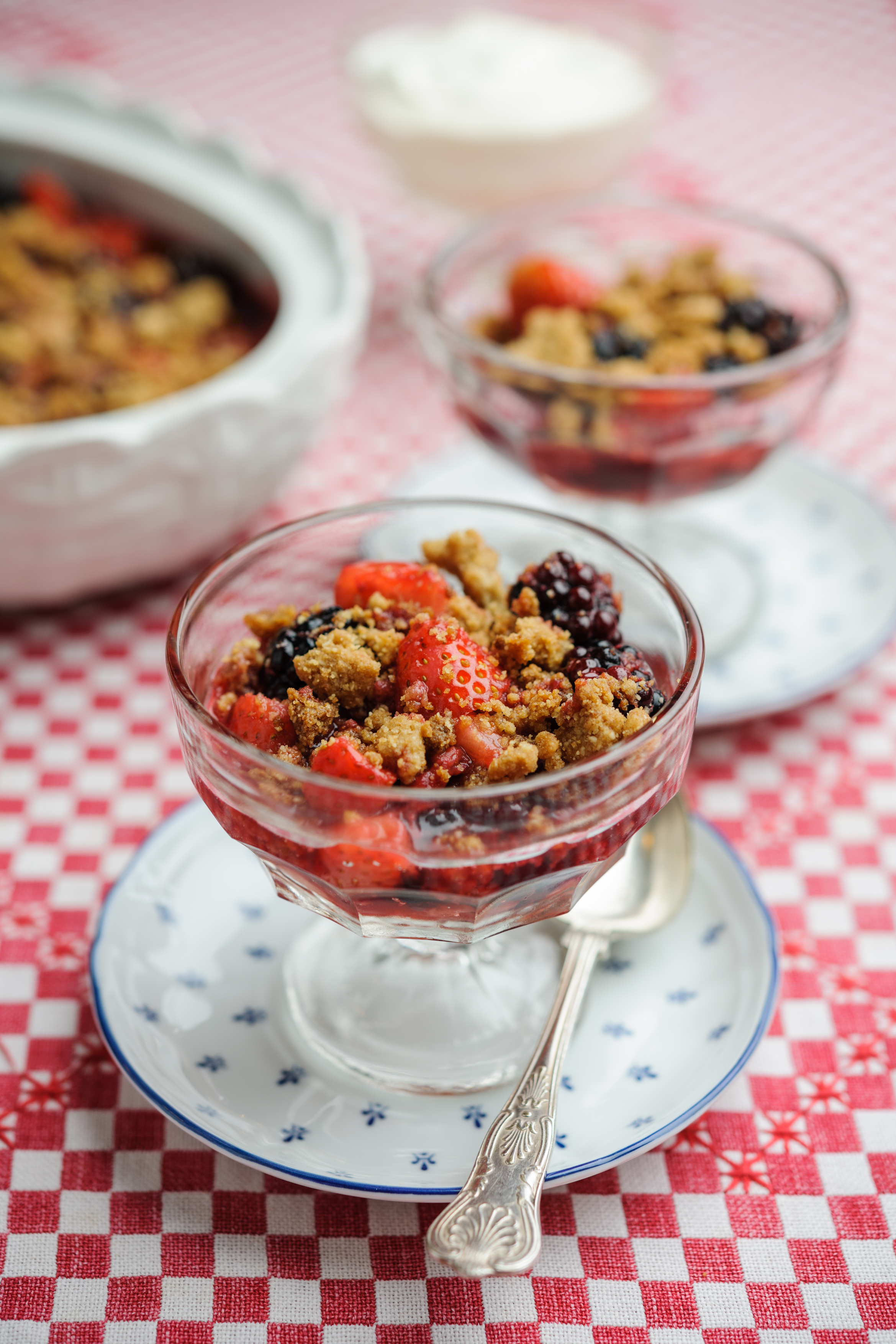 This elegant recipe looks beautiful served in individual glass dishes. The key is cooking the crumble and the compote separately, and then bringing them together at the end. The rosewater and elderflower bring out the fragrance of the strawberries, making this a simple yet sophisticated dessert.