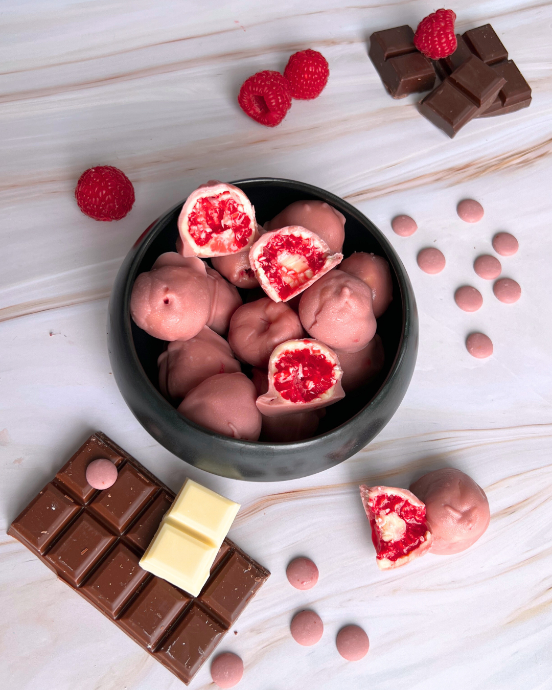 Delicious bites of chocolate-covered raspberries, inspired by the famous Franui, revisited in a pink version to mark Breast Cancer Awareness Month.